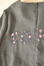 Using YR's unique method called "fab-graph", the used floral skirt is cut out into letters and hand-sewn as if it were printed.