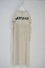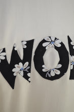 Using YR's unique method called "fab-graph", the used floral skirt is cut out into letters and hand-sewn as if it were printed.