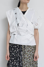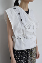usedテーブルクロスを解体しオリジナルパターンで仕立てたカシュクールカーディガン。