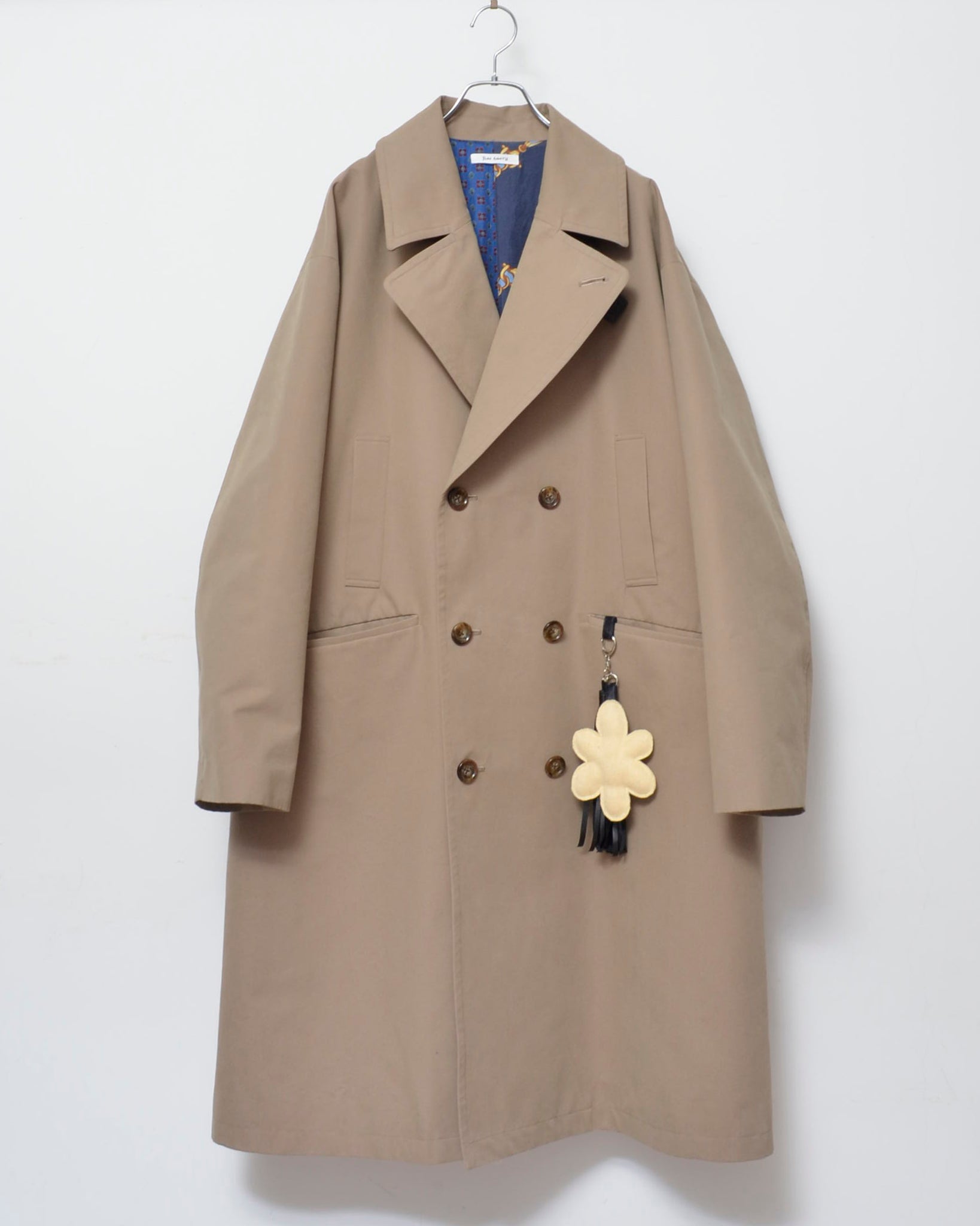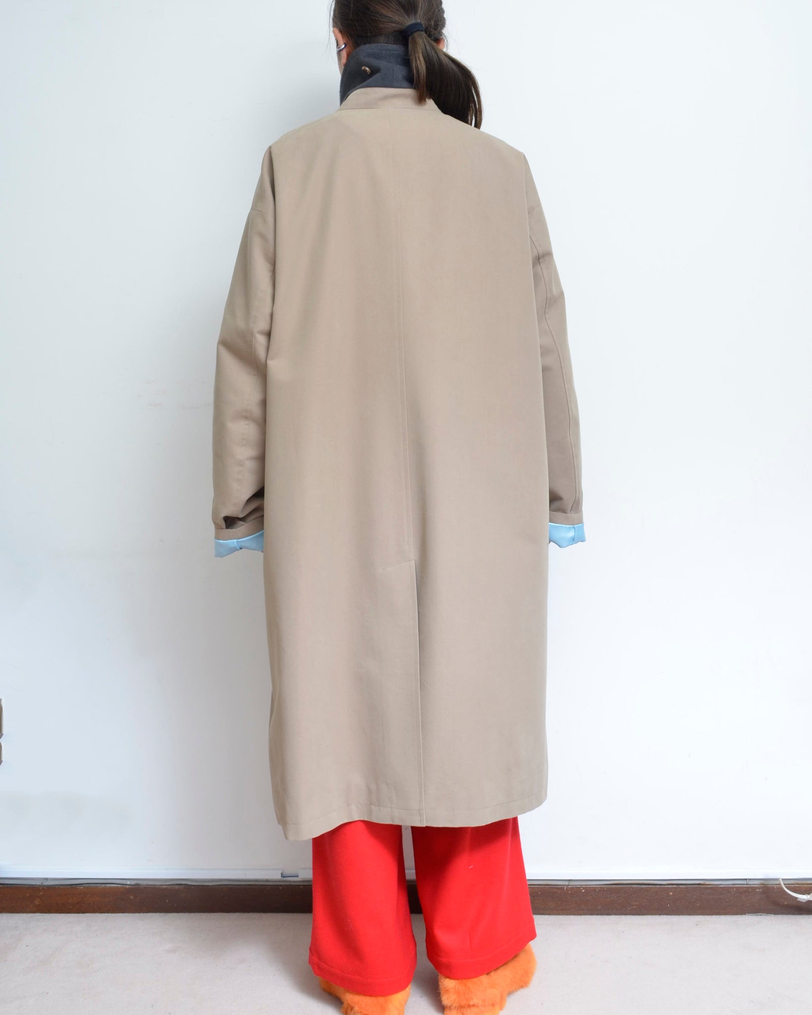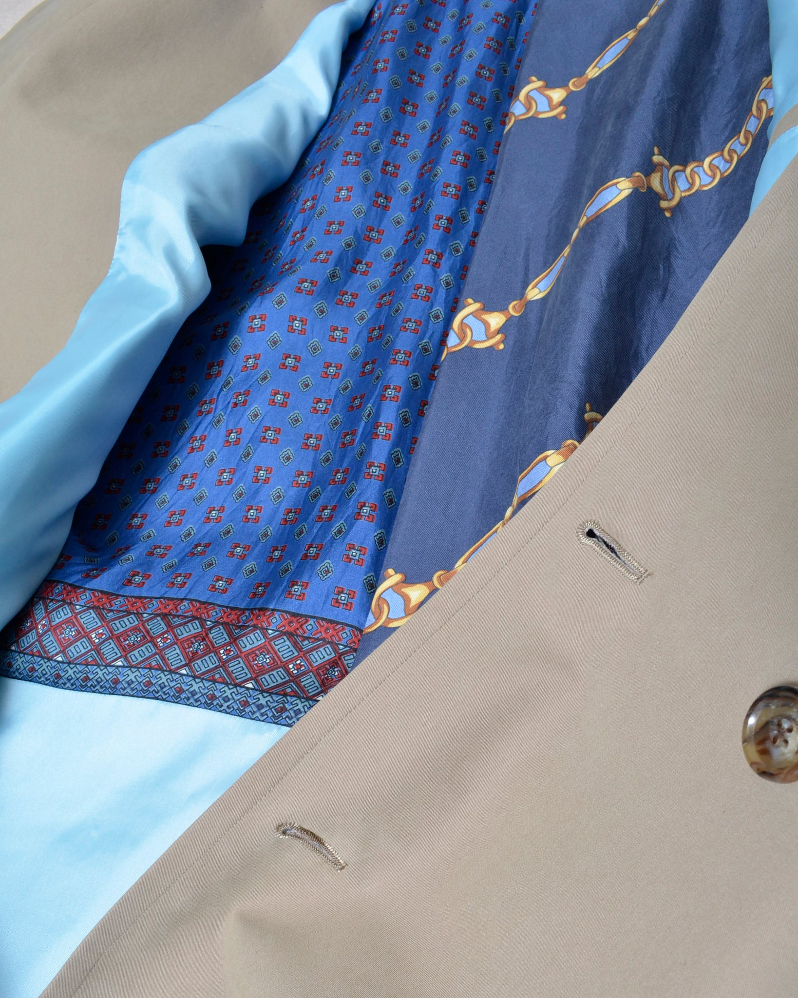 裏地はusedのスカーフと鮮やかな水色の生地を組み合わせた総裏仕立て。着脱の瞬間やハンガーに掛けたときに現れる内側の色柄が、着る人だけが感じられる小さな高揚をつくります。