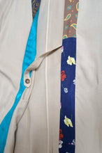 まっすぐに伸びた前たてとトレンチコートのような上衿にはusedペイズリースカーフを使用。