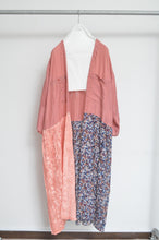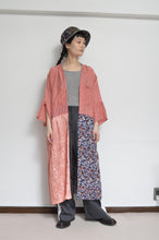 usedシャツの生地で新しく前たてを作り、2種のusedプリーツスカートと組み合わせたロングローブ。
