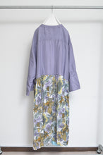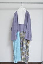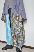 usedシャツの生地で新しく前たてを作り、2種のusedプリーツスカートと組み合わせたロングローブ。