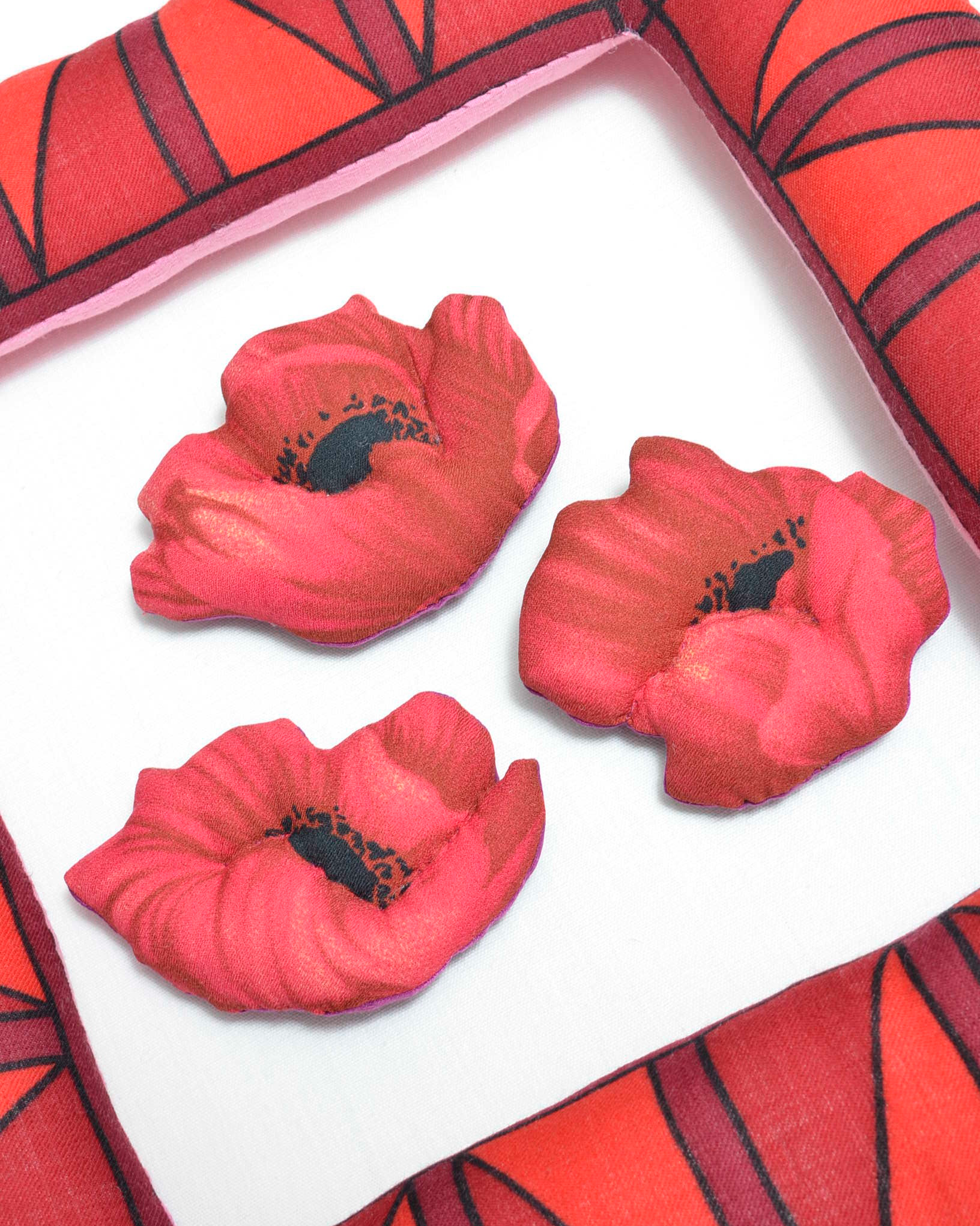 シャープな幾何学模様のフレームに、ポピーのブローチが咲いています。