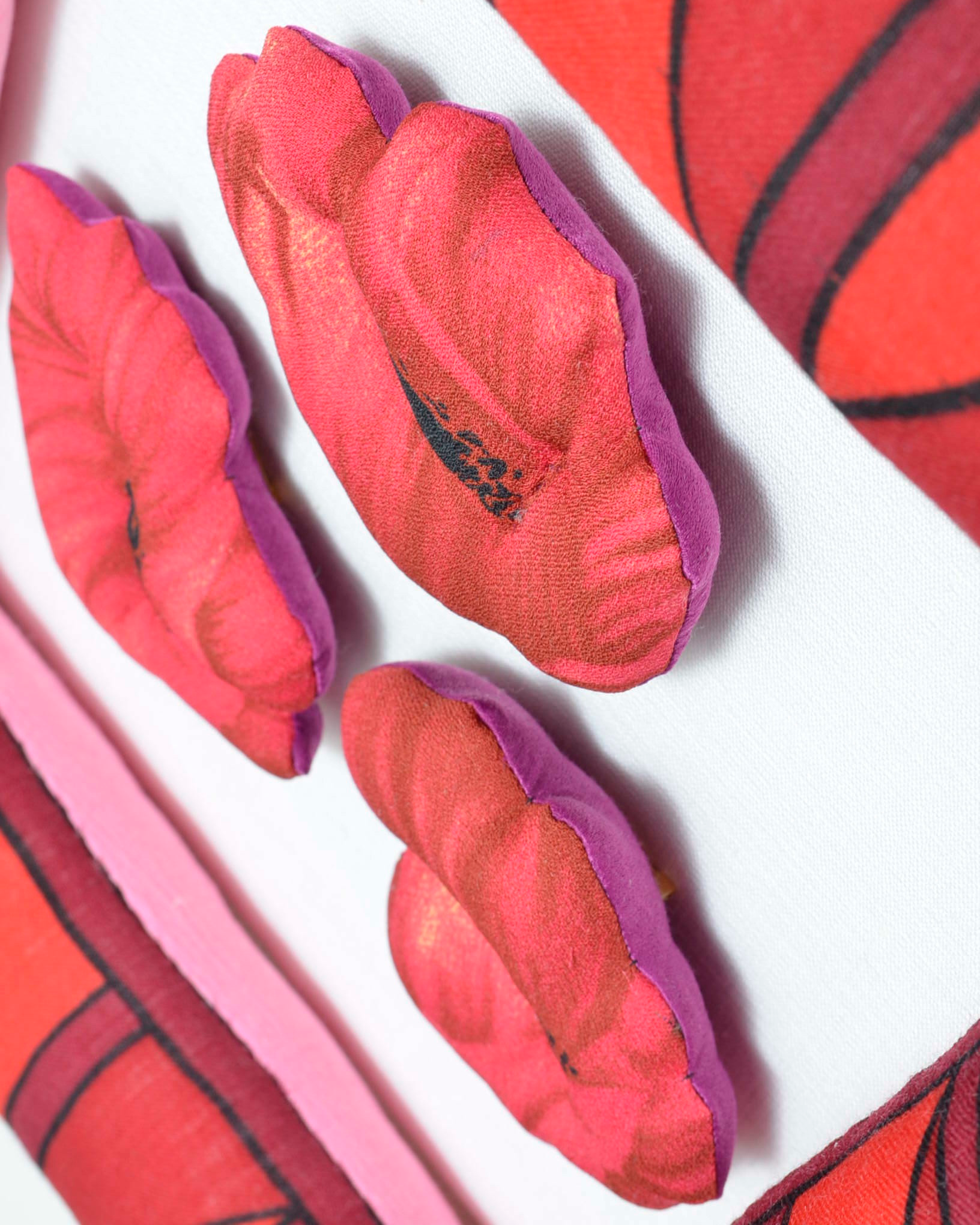 usedスカーフやテキスタイルを一点ずつ切り抜き、ワタを詰め込み、