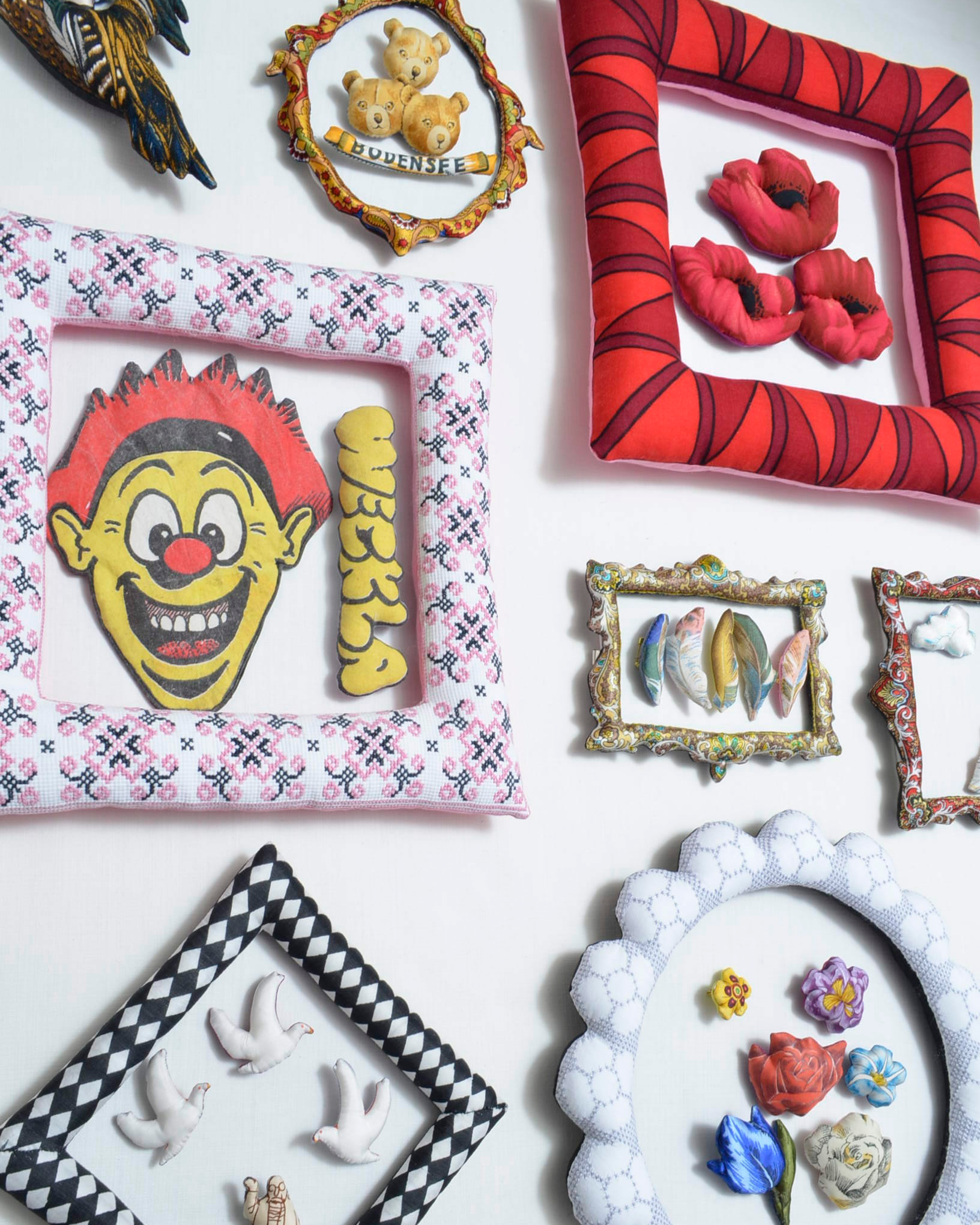 額縁や小さなモチーフとして立体化することで、布が本来持つ輪郭と記憶を新しいかたちへと再構成しています。