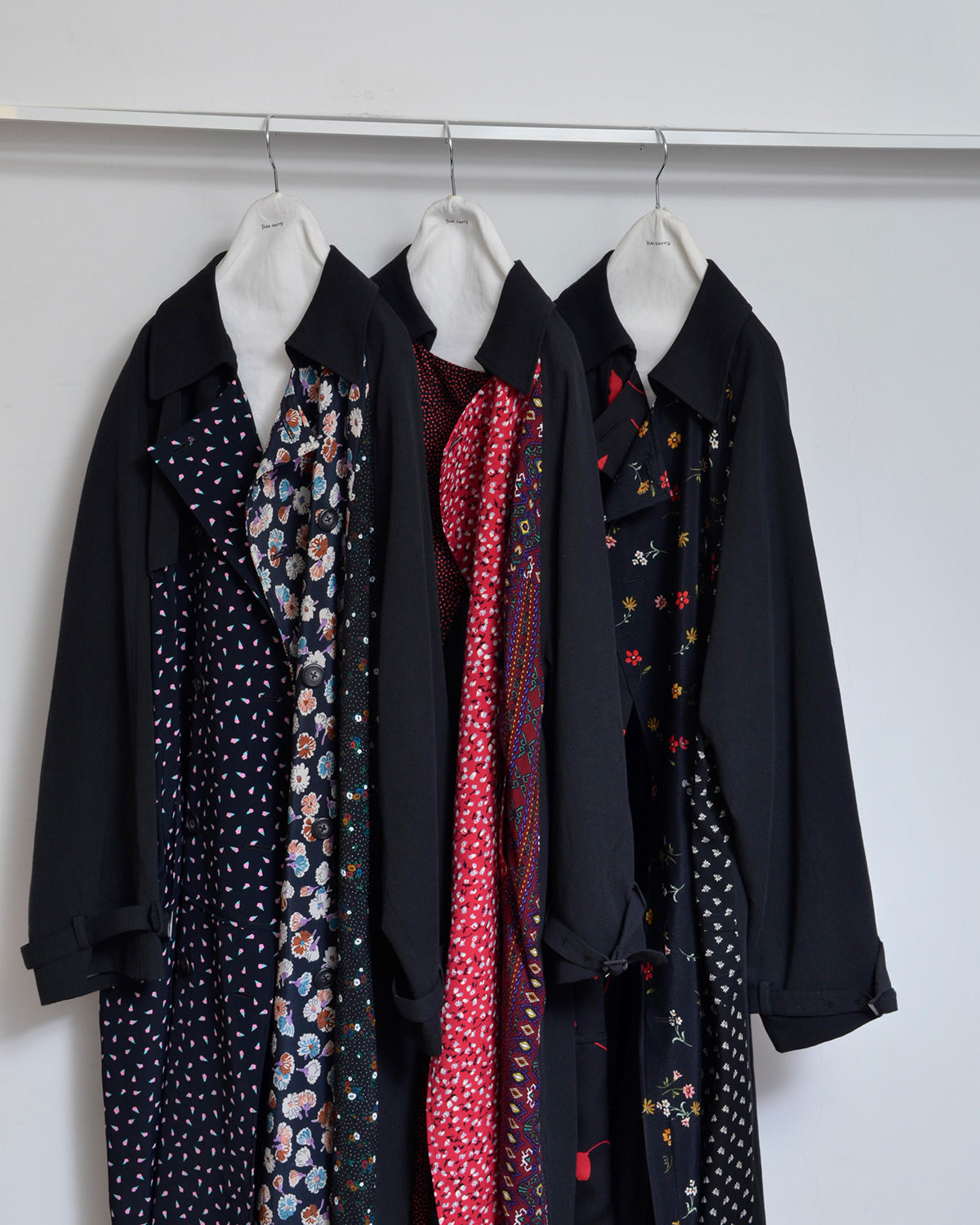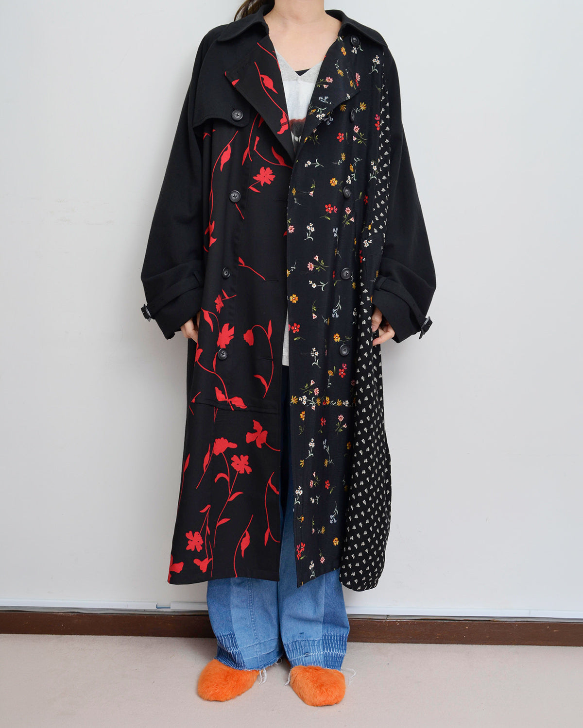 前身頃にusedフローラルスカートを解体して配したトレンチコート。