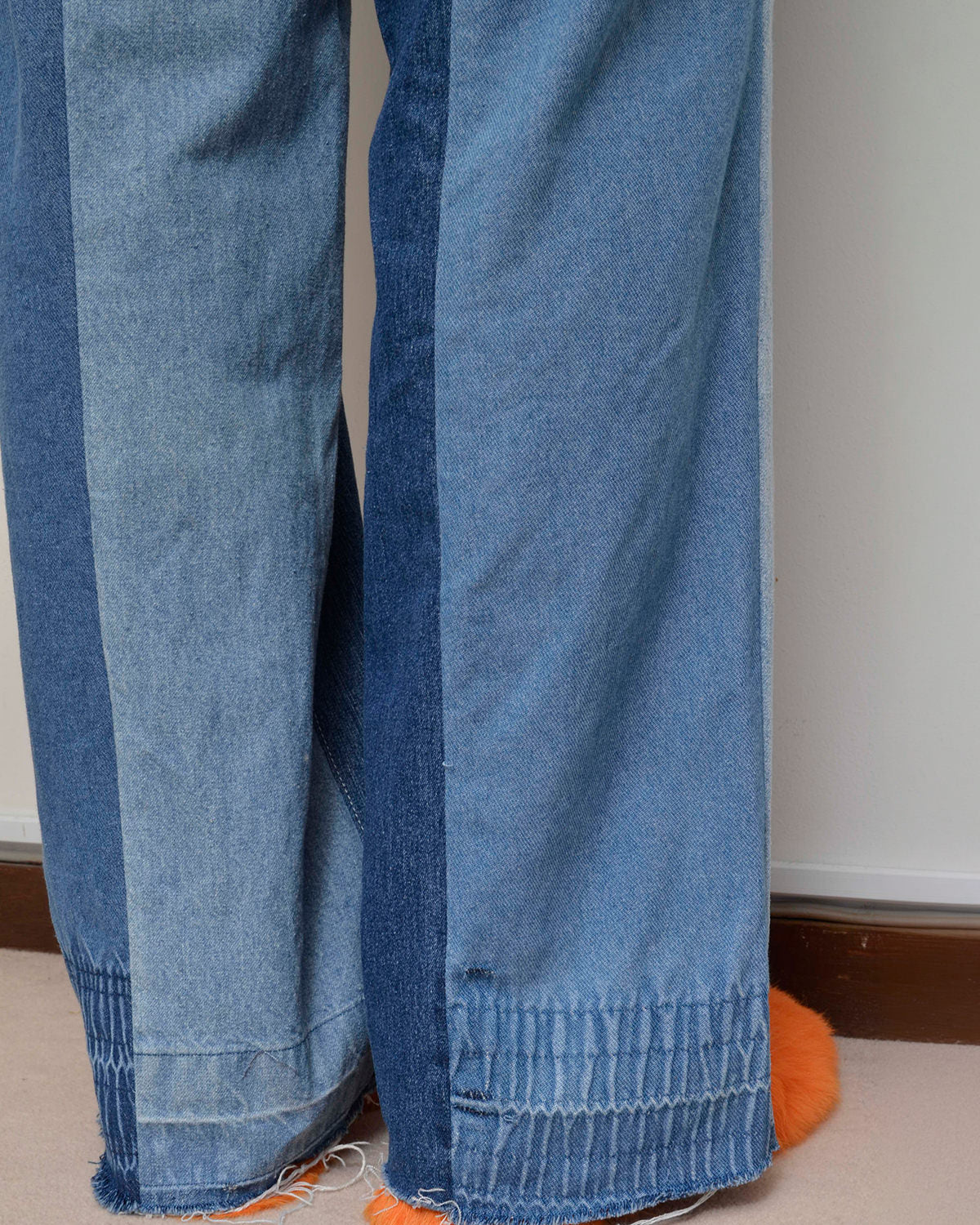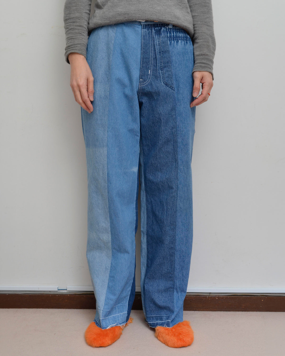usedイージーパンツを解体・再構成し、ウエストゴムの痕跡を活かした独自のパネルワークがポイント。