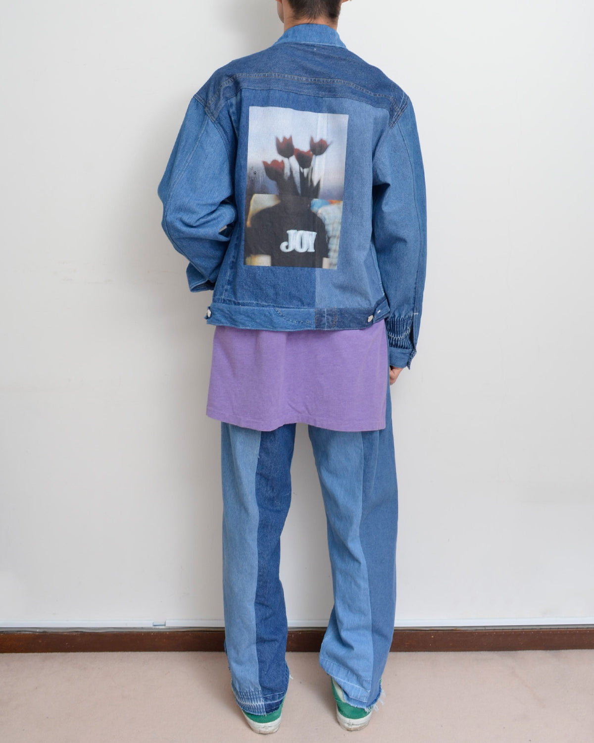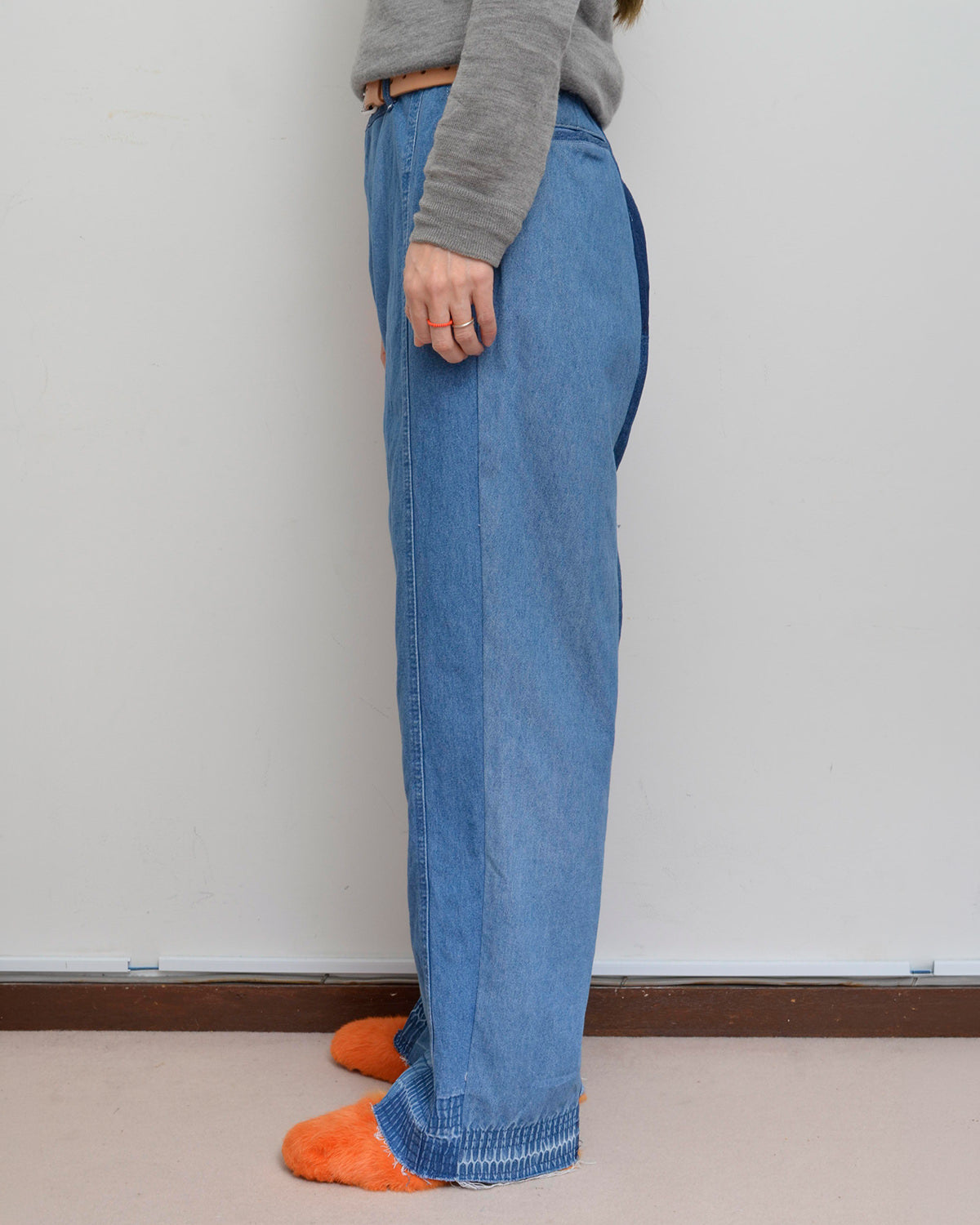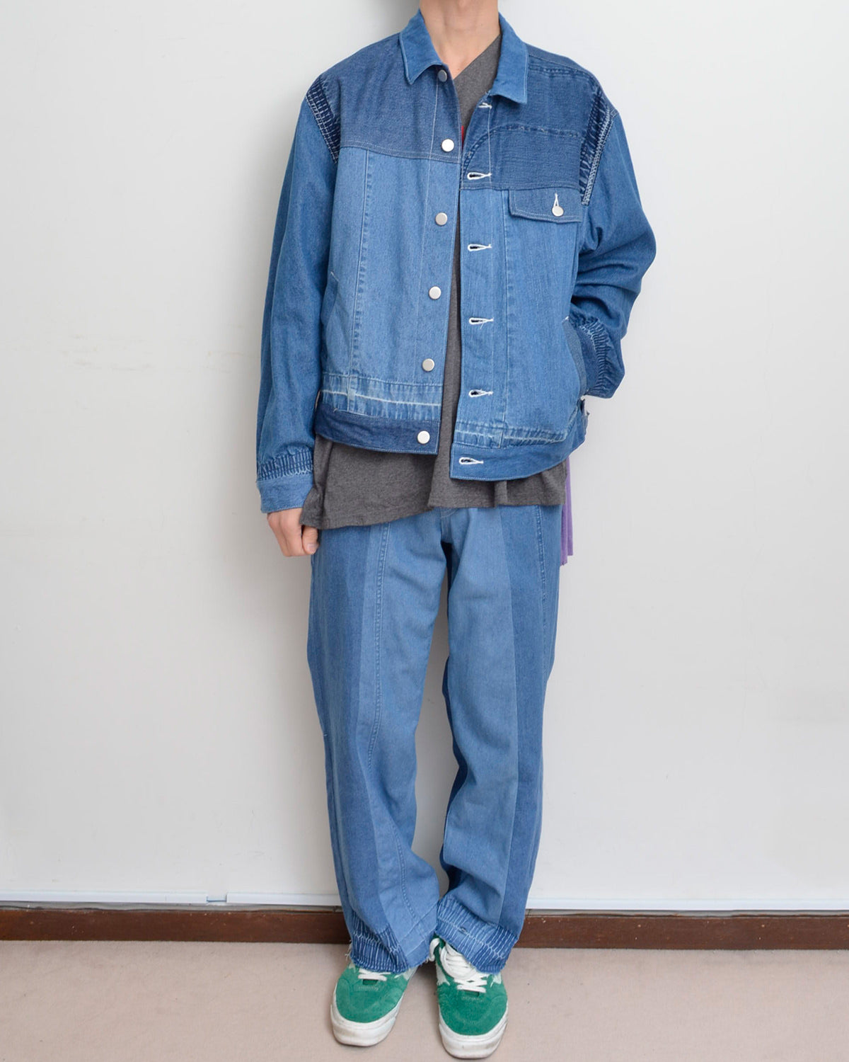 usedイージーパンツを解体・再構成し、ウエストゴムの痕跡を活かした独自のパネルワークがポイント。