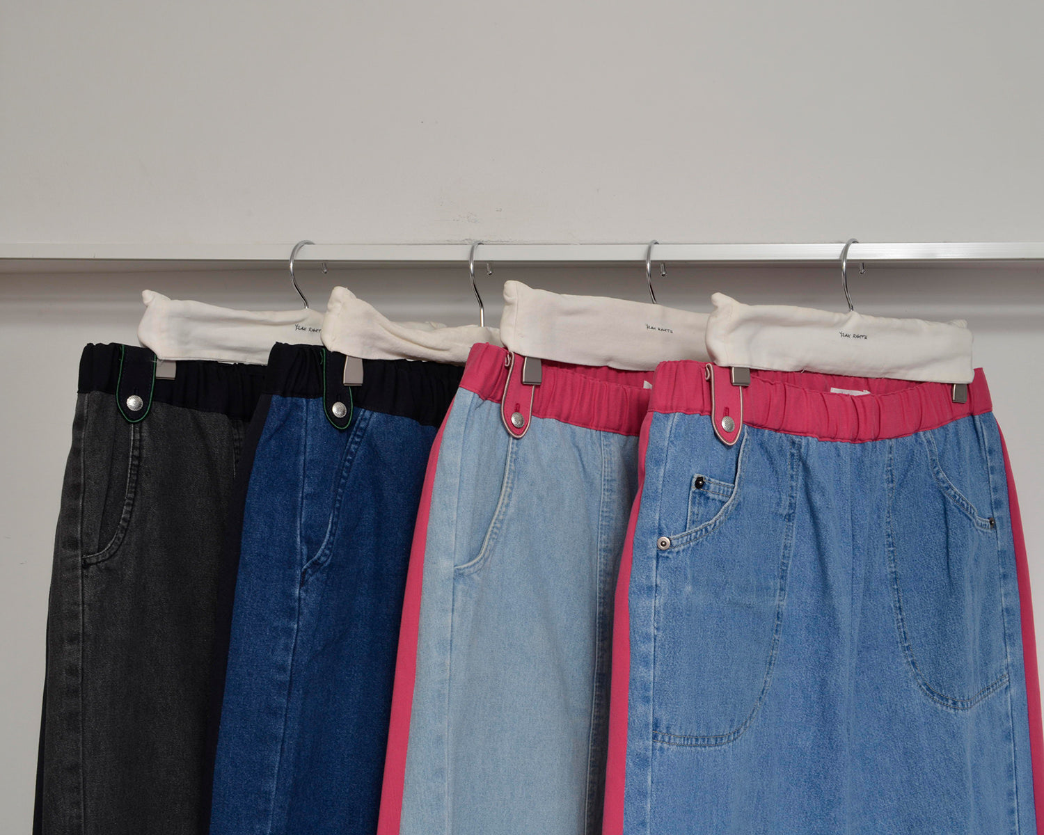 前身頃にはusedデニムのイージーパンツを大胆にそのまま使用し、ポケットも古着のディテールを活かしています。