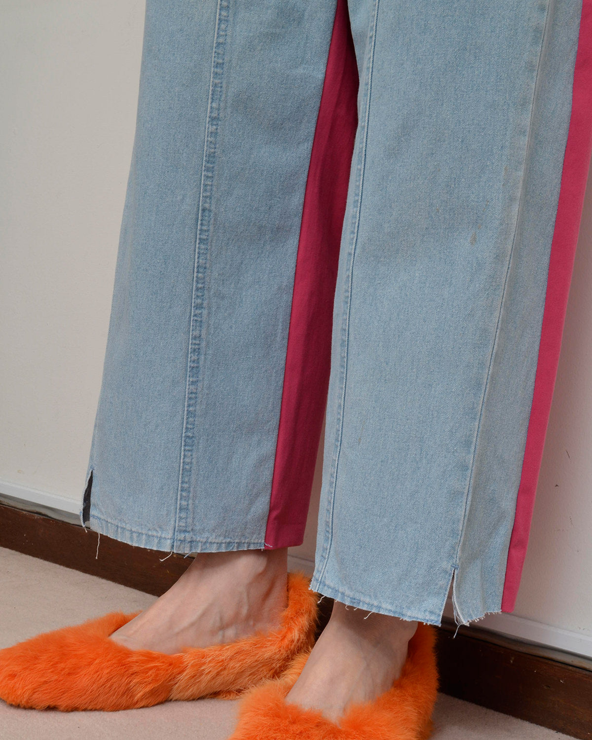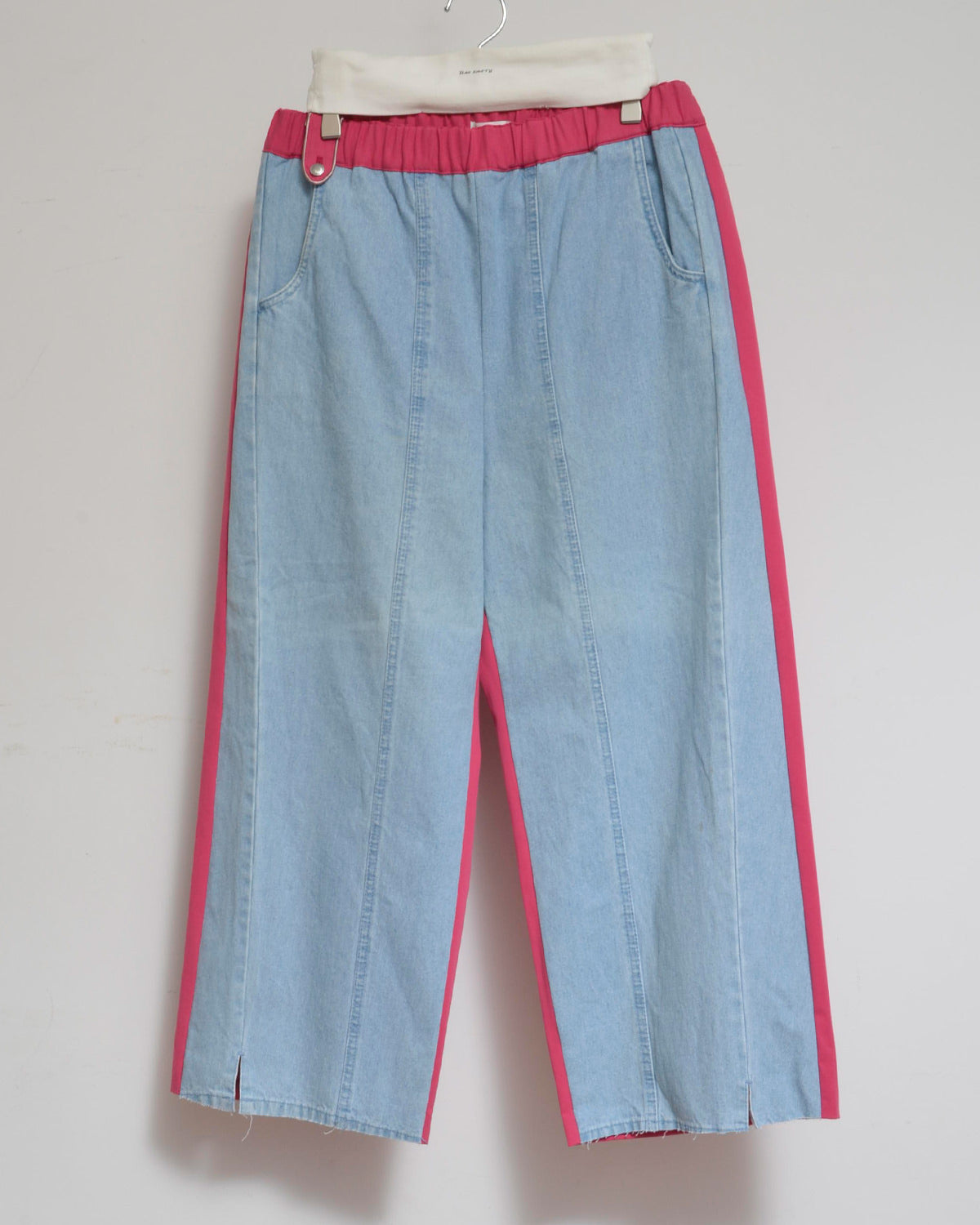前身頃にはusedデニムのイージーパンツを大胆にそのまま使用し、ポケットも古着のディテールを活かしています。